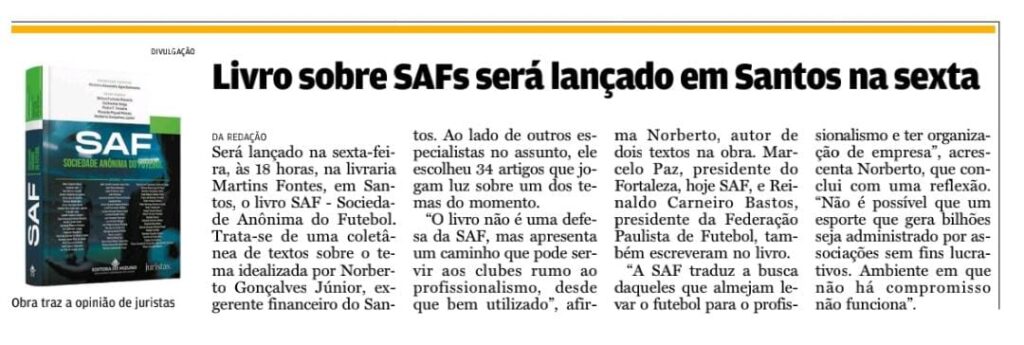 Na próxima sexta-feira (22/8), às 18h, na livraria Martins Fontes (Av. Ana Costa, 530b – Gonzaga, Santos), será lançado o livro “SAF – Sociedade Anônima do Futebol”, obra coletiva que reúne especialistas em Direito e gestão esportiva.